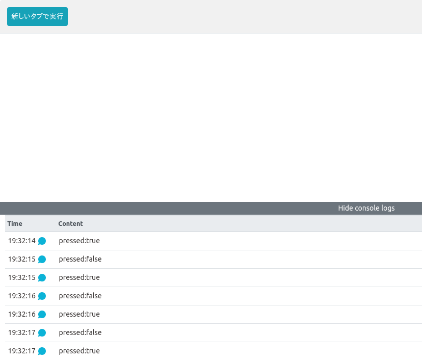 Now open the console logs (the part that says "Show console logs"), and you will see the following text when you press the button.
